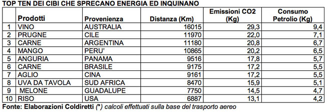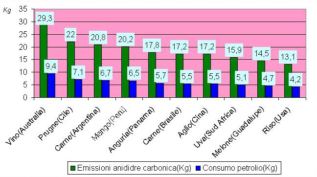 petrolio e l'emissione di 29,3 Kg di anidride carbonica; le prugne del Cile che