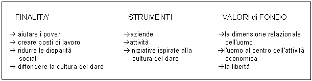 di sconfiggere la povertà, suscitando una diffusa imprenditorialità e costituendo aziende che, pur operando nel mercato, si facciano carico del bene comune e siano fortemente orientate alla solidarietà e alla condivisione;