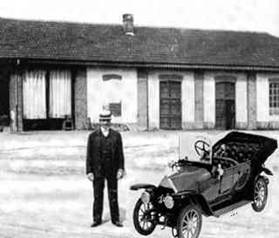 Agnelli posa davanti alla nuova fabbrica Fiat (con 50 operai) in Corso Dante, accanto alla prima auto, La Fiat 0.