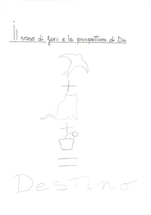 Quel vaso era lì proprio per stare esposto a quella finestra. Se lui l'avesse levato per impedir la disgrazia, l'avrebbe impedita oggi; domani la vecchia serva negra avrebbe rimesso il vaso al suo posto, sul davanzale: appunto perché il davanzale, per quel vaso, era il suo posto. E il gatto, cacciato via oggi, sarebbe ritornato domani a dar la caccia alle due rondini.