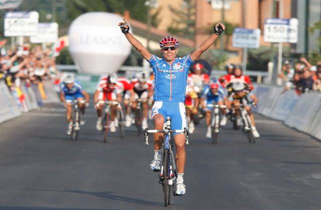 Immagine dell'arrivo del campionato del mondo di Varese 2008 vinto dal nostro corridore italiano Alessandro Ballan