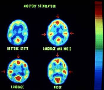 Nella foto, la PET eseguita sul cervello di un individuo evidenzia l'attività delle cellule cerebrali a riposo e durante tre tipi di stimolazione auditiva.