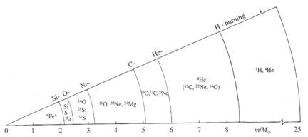In figura la strutturazione interna "a cipolla" di una stella di 25 masse solari al termine dei bruciamenti nucleari, immediatamente prima dell'innesco del collasso del nucleo.