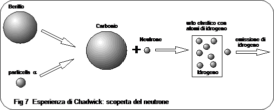 Solo molto più tardi (1932) James Chadwick, bombardando il Berillio con particelle a scoprì che nei nuclei sono presenti anche particelle neutre, aventi una massa dello stesso ordine di grandezza del protone, anche se leggermente superiore, che vennero chiamati neutroni.
