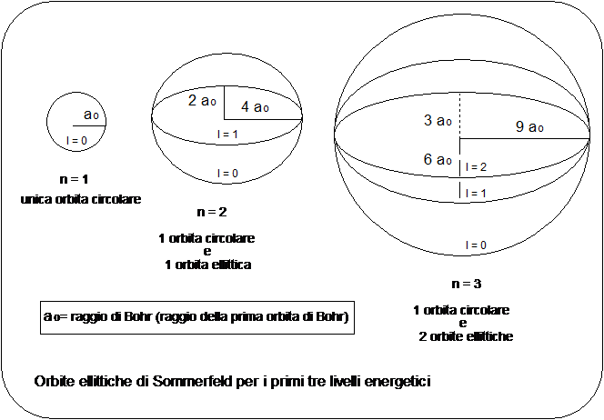 Nel terzo livello era poi possibile per l'elettrone occupare, oltre all'orbita circolare due orbite ellittiche aventi assi maggiori uguali al diametro dell'orbita circolare, ma diversa eccentricità e cosi via.