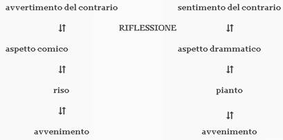 "Vedo una vecchia signora, coi capelli ritinti, tutti unti non si sa di quale orribile manteca, e poi tutta goffamente imbellettata e parata d'abiti giovanili. Mi metto a ridere. Avverto che quella vecchia signora è il contrario di ciò che una vecchia rispettabile signora dovrebbe essere. Posso così, a prima giunta e superficialmente, arrestarmi a questa impressione comica. Il comico è appunto un avvertimento del contrario. Ma se ora interviene in me la riflessione, e mi suggerisce che quella vecchia signora non prova forse nessun piacere a pararsi così come un pappagallo, ma che forse ne soffre e lo fa soltanto perché pietosamente s'inganna che, parata così, nascondendo così le rughe e la canizie, riesca a trattenere a sé l'amore del marito molto più giovane di lei, ecco che io non posso più riderne come prima, perché appunto la riflessione, lavorando in me, mi ha fatto andar oltre a quel primo avvertimento, o piuttosto, più addentro: da quel primo avvertimento del contrario mi ha fatto passare a questo sentimento del contrario. Ed è tutta qui la differenza tra il comico e l'umoristico.