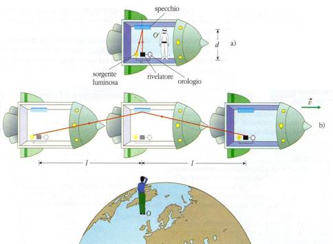 Assodato che il tempo non è assoluto, questa fondamentale grandezza fisica non può scorrere con lo stesso ritmo in tutti i sistemi di riferimento. Con molta probabilità, se per un osservatore un fenomeno dura un certo intervallo di tempo Δt, per un altro, che si trovi in movimento rispetto al primo, dovrà durare un tempo diverso Δt Consideriamo un'astronave in movimento nello spazio in cui viene accesa una sorgente luminosa, che viene riflessa in uno specchio e ritorna così nel punto di partenza. Per un osservatore posto sulla Terra, però, l'astronave è in movimento: la luce emessa dalla sorgente per lui, per raggiungere lo specchio e tornare indietro, percorre un tragitto più lungo, corrispondente ai lati obliqui di un triangolo, come si vede dall'immagine.