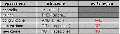 Le istruzioni AND e OR, dette operatori logici, sono prese dall'algebra di Boole e forniscono il risultato 1 o 0, a seconda del valore delle variabili A e B. Ad esempio, se entrambe le variabili A e B valgono 1, allora l'operatore AND assumerà il valore 1. In questo caso, il simbolismo, tradotto in parole, corrisponde a: