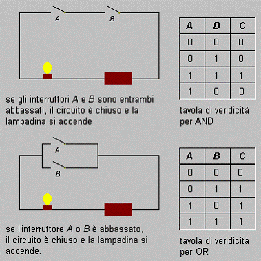 Per esempio, osservando il circuito elettrico schematizzato (figura 5), è facile riconoscere che la lampadina si accenderà solo se entrambi gli interruttori A e B verranno abbassati in modo da chiudere il contatto elettrico. Questo circuito, corrisponde ad un operatore logico AND.
