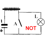 Oltre alle porte AND e OR, c'è la porta NOT, capace di invertire il segnale in ingresso: se vale 1, diventa 0 e viceversa(vedi figura 8). Le porte logiche descritte, sono rappresentate simbolicamente con i simboli in figura 7; combinandoli fra loro, si può codificare in linguaggio binario qualsiasi diagramma di flusso. Per esempio, la frase 'se è bel tempo ed è caldo esco; tuttavia, se ho un impegno esco in ogni caso' richiede una porta AND ed una porta OR unite tra loro come in figura6.