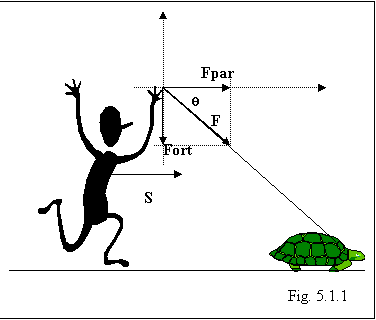esempio, un uomo viene tirato per un tratto S verso destra da una tartaruga mediante una forza F esercitata in direzione basso-destra.