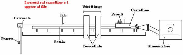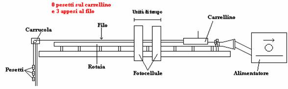 Mettere sul carrellino 2 pesetti, legarlo con un filo il quale, passando per una carrucola, ha a sua volta un altro pesetto appeso all'estremità, lasciato libero nel vuoto;