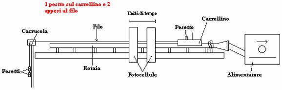 Materiale occorrente: rotaia, carrellino (93g), carrucola, filo, pesetti (2g ognuno), fotocellule, computer, alimentatore