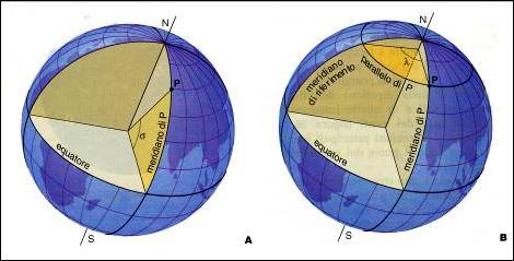 L'altra misura di cui abbiamo bisogno per determinare un punto è la longitudine definita come l'angolo diedro che si forma tra il piano del meridiano passante per il punto e il piano del meridiano di riferimento. Anche in questo caso avremo l'indicazione E (est) oppure O (ovest) se il punto si trova da una parte o dall'altra rispetto al meridiano zero (Greenwich).