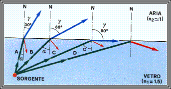 L'angolo limite. Nel caso in cui la luce passa da un mezzo più denso a un mezzo meno denso (ad esempio dal vetro all'aria), il raggio incidente che proviene dal vetro si rifrange nell'aria, allontanandosi dalla normale; perciò l'angolo di rifrazione è maggiore dell'angolo di incidenza. All'aumentare dell'angolo incidente (vedi figura 1) il raggio rifratto sarà radente alla superficie di separazione dei due mezzi e l'angolo di rifrazione assumerà il valore di 90°. L'angolo di incidenza a cui corrisponde un angolo di rifrazione di 90° si chiama angolo limite.