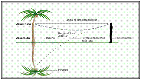 Miraggio. Generalmente gli strati dell'aria atmosferica più vicini alla Terra sono anche quelli più densi. Se però la Terra è molto calda può accadere che gli strati più bassi, che sono a più diretto contatto col suolo, siano meno densi degli strati superiori. Questo avviene nelle giornate molto calde d'estate e più frequentemente nei deserti.