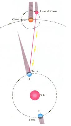 Roemer utilizzò come "mappamondo" il pianeta Giove, come sorgente luminosa S uno dei quattro satelliti medicei e come tratto AB la distanza percorsa dalla Terra verso Giove nel tempo impiegato dal satellite a percorrere la sua orbita gioviana (fig. 10). Ecco allora che, posta la terra in B, noto il ritardo t rispetto alle previsioni dell'astronomo Cassini valide quando la terra è in A, dovuto al tempo che la luce impiega per percorrere il tratto AB, si poté dare una stima della sua velocità: