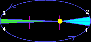 II Legge: la velocità di ciascun pianeta che percorre l'orbita ellittica varia in modo tale che una linea retta che congiunge il Sole ed il pianeta spazza in eguali intervalli di tempo uguali porzioni di superficie dell'ellisse. Il carattere rivoluzionario delle due leggi consiste nel fatto che, per la prima volta, una singola curva geometrica non combinata con altre curve ed una singola legge di moto sono sufficienti per potere prevedere la posizione dei pianeti e per la prima volta queste previsioni risultano precise quanto le osservazioni. Keplero rifiuta il sistema tolemaico ed abbandona anche l'idea che i pianeti ruotassero su orbite circolari come anche lo stesso Copernico aveva sostenuto. La terza legge venne formulata nell'opera intitolata Armonices mundi del 1619. |