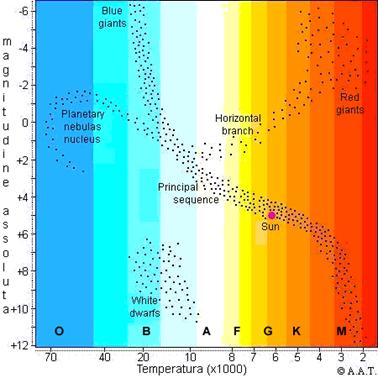 In ascissa il colore della stella espresso sotto forma di temperatura superficiale in Kelvin. In ordinate la luminosità della stella. La banda in diagonale da sinistra a destra, rappresenta la sequenza principale.