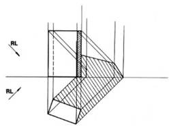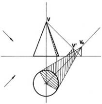 Si potrebbe parlare a questo proposito di una semplice applicazione della teoria delle intersezioni: infatti si ha intersezione fra un solido reale, quello di cui vogliamo studiare l'ombra, con un solido ideale costituito da un fascio di raggi di luce, supposti paralleli ed inclinati di 45° rispetto ai tre piani di proiezione ortogonali, con provenienza dalla sinistra del oggetto.