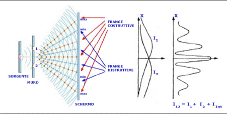 La luce viene fatta entrare in una piastra con due fenditure. Si osserva quindi, su un apposito schermo che raccoglie le immagini posizionato ad una certa distanza, il comportamento della luce dietro le due fenditure. La cosa straordinaria e rivoluzionaria per quei tempi fu che Young osservò sullo schermo bande chiare e scure che si alternavano. Se però copriva una delle due fenditure in modo che la luce passasse solo dall'altra, le bande scomparivano. Per poter spiegare la comparsa delle bande venne in aiuto il fatto che un comportamento simile era ben noto da secoli nel caso delle onde, ad esempio lo stesso esperimento può essere facilmente riprodotto con onde d'acqua. Un piccolo oggetto indicato come "sorgente d'onde" viene fatto muovere su e giù e produce onde circolari che vengono diffratte attraverso i due fori così che dall'altra parte della piastra otteniamo due onde semicircolari(fig.1). Se chiudiamo un foro alla volta e misuriamo la distribuzione d'intensità sul rilevatore posto dietro la doppia fenditura otteniamo le curve d'intensità I1 e I2 (fig.1)