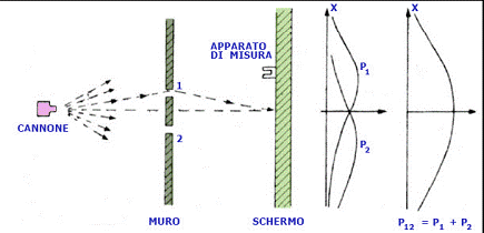 ciascun fotone attraversa o il foro 1 oppure il foro 2, quindi sembra sempre ragionevole pensare che la luce si comporti come nel caso di proiettili sparati contro un muro con due fenditure. La probablità di trovare un proiettile in un punto dietro al muro quando i due fori sono aperti è la somma delle probabilità di trovarlo nello stesso punto quando a turno è aperto soltanto uno dei due fori.