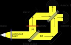 Ora un raggio di luce proveniente da sinistra viene parzialmente riflesso dal primo specchio semiriflettente e in parte viene attraversato, metà della luce quindi prende la traiettoria superiore e l'altra metà quella inferiore. Ciascuno di questi due raggi arriva poi ad un altro specchio che lo riflette completamente. I due raggi si incontrano così nuovamente nel secondo specchio semiriflettente. Se non consideriamo l'interferenza ognuno dei due raggi viene diviso nuovamente in due fasci metà riflesso e metà no, quindi metà del raggio andrà verso l'alto rispetto all'ultimo specchio e l'altra metà verso la nostra destra.