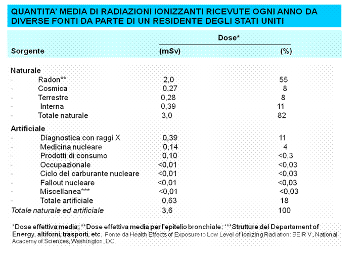 Gli esseri umani sono continuamente esposti ad un sottofondo di radiazioni ionizzanti naturali provenienti da: raggi cosmici, elementi radioattivi nella crosta terrestre, radionuclidi naturalmente presenti nel corpo umano (C-14, K-40) e radon inalato. In aggiunta, gli esseri umani ricevono radiazioni anche da varie fonti costruite dall'uomo, come: i raggi X, componenti di televisori, segnalatori di fumo e dall'energia nucleare. L'esposizione a queste fonti è raddoppiata nei trascorsi 20 anni negli Stati Uniti e in molti altri Paesi.