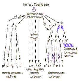 I raggi cosmici si dividono in primari e secondari. I raggi cosmici primari sono quelli che provengono direttamente dallo spazio, mentre i raggi cosmici secondari sono quelli che nascono da un processo a cascata quando i raggi cosmici primari collidono con gli atomi dell'alta atmosfera generando un flusso di particelle secondarie. La componente primaria dei raggi cosmici è principalmente costituita da nuclei, in particolare protoni all'87% e particelle alfa (nuclei di elio) nel 12% dei casi. Il rimanente 1% è composto da nuclei di atomi via via più pesanti fino all'uranio (seppur in bassa percentuale i raggi cosmici includono essenzialmente tutti gli elementi della tavola periodica). Queste particelle riescono a percorrere enormi distanze fino alla terra per via della bassissima densità di materia nello spazio interstellare che per questa ragione esercita uno scarsissimo effetto "frenante" o assorbente su queste particelle. Esse iniziano invece a reagire energicamente con altre particelle proprio quando incontrano l'atmosfera terrestre e danno origine ai raggi cosmici secondari. Questi sono costituiti da una "componente soft" rappresentata da elettroni, positroni, neutroni e fotoni e una "componente hard" costituita da particelle molto penetranti ed energetiche come i muoni che derivano dal decadimento di mesoni energetici ed altamente instabili denominati pioni e kaoni. Questi muoni non interagiscono fortemente con l'atmosfera per cui riescono a giungere fino a terra prima di scomparire anche grazie all'effetto di dilatazione relativistica del tempo dal momento che essi viaggiano ad una velocità prossima a quella della luce. I muoni sono altamente instabili e decadono in un elettrone e due neutrini (un neutrino elettronico e un neutrino muonico) nell'arco di qualche microsecondo. Negli sciami che costituiscono il processo a cascata dei raggi cosmici secondari vengono prodotti sia muoni che anti-muoni in misura pressoché uguale. Ogni anti-muone decade in un positrone, un neutrino elettronico e un antineutrino muonico. I muoni hanno un notevole ruolo nella ionizzazione della bassa atmosfera. Quando un muone ionizza una molecola di gas, ne strappa un elettrone, rendendo quella molecola uno ione positivo, mentre l'elettrone perso viene catturato da un'altra molecola di gas creando uno ione negativo. Succede che gli ioni negativi sono più "mobili" di quelli positivi e ciò genera un campo elettrico nella nostra atmosfera in grado di influenzare la formazione, il moto delle nubi e il clima.