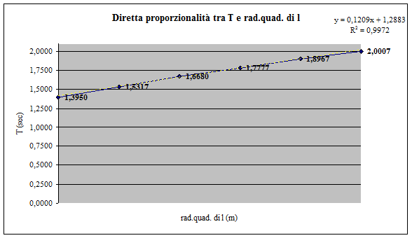Attraverso il grafico è stata dimostrata la diretta proporzionalità tra il periodo e la radice quadrata della lunghezza. Inoltre, il coefficiente angolare della retta ottenuta è molto vicino a 1.