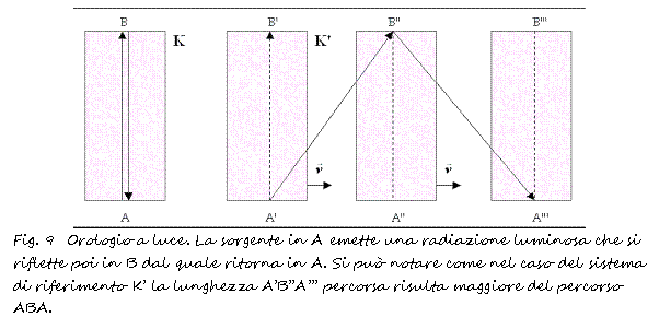 Se facciamo muovere i due specchi di una certa velocità v possiamo notare che il fotone, per tornare al rintocco, dovrà fare un percorso più lungo ed è chiaro che se si muove alla stessa velocità, farà il rintocco più tardi.