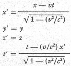 Sulla base del principio di costanza della velocità della luce è possibile determinare, dal puro e semplice punto di vista matematico, un insieme di nuove trasformazioni che collegano le osservazioni fatte da due osservatori solidali con due differenti sistemi inerziali. In questa sede non intendiamo dimostrare rigorosamente come si possa dedurre tali trasformazioni, ma ci limitiamo semplicemente ad enunciarle e a commentarle adeguatamente, mettendo bene in luce le conseguenze rivoluzionarie a cui portano. Le trasformazioni di coordinate tra due sistemi inerziali K e K , di cui il secondo trasli con velocità w lungo l'asse x del primo, sono le trasformazione di Lorentz dove c indica la velocità della luce.