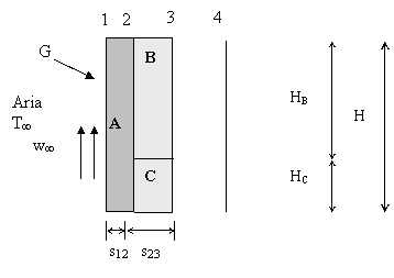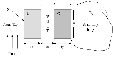 H = 4,00m; sA = sB << H; sC = T = T4 = T = Tp = hc,2 = 3,00 Wm2/K; kA = 10,0 W/mK; kC = 5,00 W/mK; e1 e2 e3 e4 G = 548 W/m2; superfici grigie