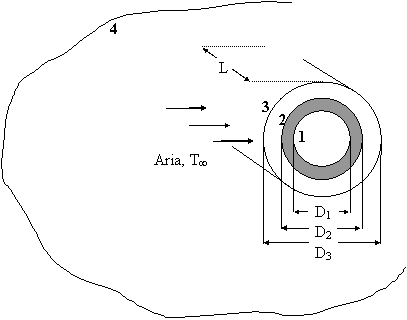 Es. La parete cilindrica delimitata dalle superfici 1 e 2 è circondata da uno schermo cilindrico coassiale molto sottile (superficie 3) che, a sua volta, attraversa un vasto ambiente delimitato dalla superficie Nell'ipotesi di flusso monodimensionale e regime stazionario, si calcoli la temperatura della superficie