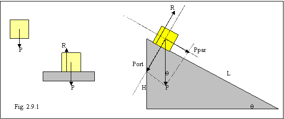 Quando il blocco è libero l'unica forza agente è la forza peso P applicata nel baricentro; se è vincolato da un piano orizzontale, oltre alla forza peso verso il basso, esiste anche una forza di reazione vincolare R uguale e contraria al peso e applicata sulla superficie di separazione blocco - pavimento (vedi paragrafo 2.2); se il blocco è appoggiato al piano inclinato, la reazione vincolare R del piano d'appoggio, dovendo essere ortogonale alle superfici in contatto, non ha la stessa direzione della forza peso (diretta invece sempre verso il basso), per cui riesce ad "annullare" il peso del blocco solo parzialmente. Quanto parzialmente? Vediamo: