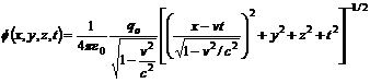 Tale relazione non è nuova, per la verità, ma compare anche nelle trasformazioni di Lorentz del potenziale elettrico f(x,y,z,t) di una carica qo che si muove a velocità v, rispetto ad un sistema di riferimento, però, naturalmente, là non è assegnato lo stesso significato che stiamo qui attribuendo. La formula del potenziale di Lorentz è la seguente: