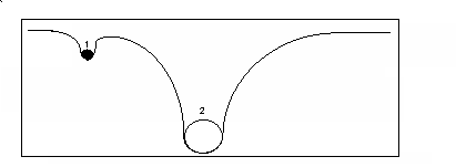 Figura 1. L'effetto risultante della deformazione dello spazio-tempo (deformazione della membrana) è la forza d'attrazione fra la massa 1 e la massa 2.