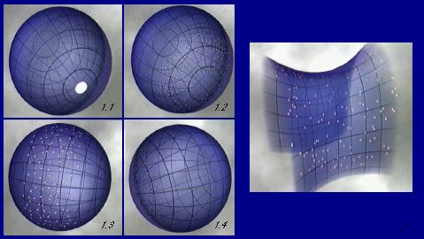 Quando il palloncino si gonfia, i coriandoli, vedendo allontanarsi gli altri coriandoli, immaginano che il centro dell'espansione sia posto sulla superficie del palloncino stesso, ma non si rendono conto che in realtà il centro di espansione (che ovviamente è il centro del palloncino) si trova al di fuori di quella, in un'altra dimensione. E' a tre dimensioni, infatti, che si espande il palloncino, e la curvatura del suo spazio ne produce la superficie.