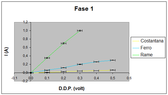 Analizzando il grafico, ricordandoci che il coefficiente angolare delle rette indica la conduttanza, cioè l'inverso della resistenza, possiamo affermare che il metallo con maggiore resistenza è quello con il coefficiente angolare più basso, ovvero la costantana (che infatti ha minore conduttanza); il metallo che offre minore resistenza al passaggio di corrente è il rame, mentre il ferro ha una resistenza intermedia. Possiamo ritenerci soddisfatti di questa prima fase dell'esperienza in quanto il nostro grafico, tenendo conto delle incertezze strumentali, è sufficientemente attendibile, e i valori ottenuti si avvicinano molto a quelli previsti, e la proporzionalità tra le 2 grandezze è, come ci aspettavamo, diretta.