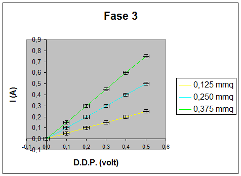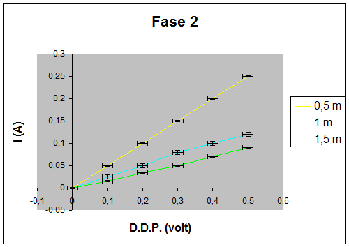 2° FASE: In questa seconda fase dell'esperienza andiamo invece a verificare il variare del rapporto I/ddp al variare della lunghezza. Per farlo prendiamo la tavoletta con installati 3 fili di costantana di sezione uguale (e pari a 125/1000mmq) e lunghezza 0,5m. Colleghiamo prima un unico filo in serie, successivamente 2 fili in serie (ottenendo una lunghezza totale di 1m) e in fine tutti e 3 i fili in serie (1,5m). Per ognuna di queste lunghezze, come abbiamo fatto nella fase 1, misuriamo il variare dell'intensità al variare della ddp, e riportiamo i dati in tabella: