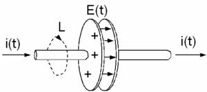 Sia L la spira in questione; abbiamo piena libertà di scegliere una superficie aperta, purché abbia orlo L, tale per cui la corrente di conduzione i(t) sia concatenata ad essa (un cerchio con circonferenza L andrà bene). Per ogni particolare scelta, la circuitazione del campo magnetico lungo L deve avere un valore diverso da zero. La legge di Ampère ci assicura che questo valore della circuitazione deve essere lo stesso comunque si consideri una superficie con bordo L. Immaginiamo però di costruire una superficie che non tocchi nessun elemento fisico del circuito; questo è possibile se facciamo attraversare alla superficie in questione la zona compresa tra i due piatti del condensatore, in cui non avviene alcuno scambio di materia.