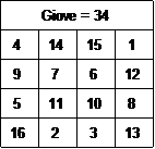 La somma 34 può essere trovata nelle righe, colonne, diagonali, ciascuno dei quadranti, i quattro quadrati centrali, i quadrati degli angoli, i quattro numeri esterni in senso orario dagli angoli (3+8+14+9) e similarmente i quattro in senso antiorario (le posizioni di quattro regine nelle due soluzioni del puzzle delle 8 regine), i due insiemi di quattro numeri simmetrici (2+8+9+15 e 3+5+12+14) e la somma delle due voci centrali delle due colonne e righe esterne (per esempio 5+9+8+12), così con la forma di aquiloni ha modellato i quartetti, per esempio 3+5+11+15; i due numeri nel mezzo della fila inferiore danno la data dell'incisione: .