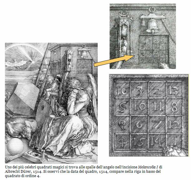 Uno degli esempi più famosi è sicuramente il quadrato magico di tipo simmetrico che compare nell'incisione di Albrecht Dürer, Melancolia I. Si ritiene che esso sia il primo quadrato magico a comparire nell'arte occidentale. È molto simile al quadrato di Yang Hui, che fu generato in Cina circa 250 anni prima del tempo del Dürer. L'artista tedesco non spiegò mai il simbolismo contenuto in questa sua opera, ma la maggior parte degli studiosi è d'accordo sul fatto che essa rappresenti lo stato d'animo depresso del pensatore, incapace di passare all'azione. Nel Rinascimento il temperamento malinconico era ritenuto una caratteristica del genio creativo; era la malattia degli studiosi 'che una pallida maschera di pensiero fa sembrare ammalati': questo concetto, che gli intellettuali brillanti siano spesso incapaci, come Amleto, di prendere delle decisioni, è, in una certa misura, ancora vivo fra noi.