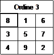 Il quadrato "Lo Shu" è un quadrato magico normale di ordine 3, cioè una matrice di aspetto 3×3 contenente tutti gli interi da 1 a 9 senza ripetizioni disposti in modo tale che sommando i numeri sulle diverse righe, colonne o diagonali si ottenga sempre lo stesso valore, che deve essere (1+2++9)/3 = 15.