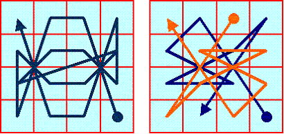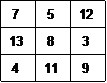 e così via. Si può assumere m negativo e di grandezza compatibile con l'ennesimo numero della serie ordinata in quadrato magico per evitare ripetizioni, come ad esempio, nel quadrato sottostante di modulo 3 nel quale r =1 m = -6, e che sarebbe derivato da quello accanto. Evidentemente quello derivato non è altro che il diretto che si sarebbe però ottenuto coi numeri 3, 4, 5, 7, 8, 9, 11, 12, 13 cioè con r =1 e m =2.