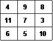 numeri interi distinti in una tabella quadrata tale che la somma dei numeri presenti in ogni riga, in ogni colonna e in entrambe le diagonali dia sempre lo stesso numero; tale intero è denominato la costante di magia o costante magica o somma magica del quadrato.