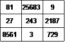 V. Avremo un quadrato magico a potenza (caso particolare di quelli a prodotto) ogni qualvolta che gli esponenti dati alla stessa base siano tali da costituire un quadrato magico. Nell'esempio sottostante in ogni riga, colonna e diagonale si avrebbe come prodotto costante 315, ossia 35x3.
