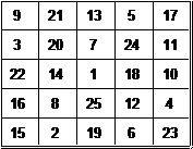 Il metodo per costruire un quadrato magico con n dispari è abbastanza semplice. Si inizia mettendo 1 nella colonna centrale della fila superiore.