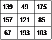 Ad esempio diamo alle costanti i seguenti valori x = 3, a = 1 e b =5. Ne consegue quindi che c = 2x5-1 = 9. In questo modo potremo costruire il seguente quadrato.