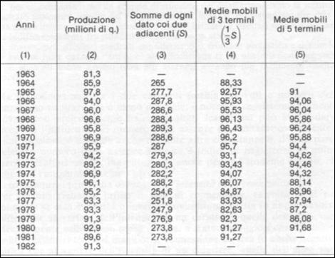 Nella tabella sono indicati i calcoli occorrenti per le medie mobili di tre termini, nonché per le medie di cinque termini.